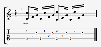 Das Picking ist ein so genanntes cross-picking, das im Original in einem für eine Ballade relativ schnellen Tempo gespielt wird. Da man aber nichts schnell versuchen sollte was noch nicht langsam funktioniert hier also als erstes das Picking in langsam.