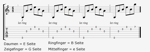 Als erstes positioniere deine Picking-Hand so das der Daumen auf der tiefen E-Seite, der Zeigefinger auf der G-Seite, der Mittelfinger auf der B-Seite und der Ringfinger auf der hohen E-Seite locker aufliegt.
